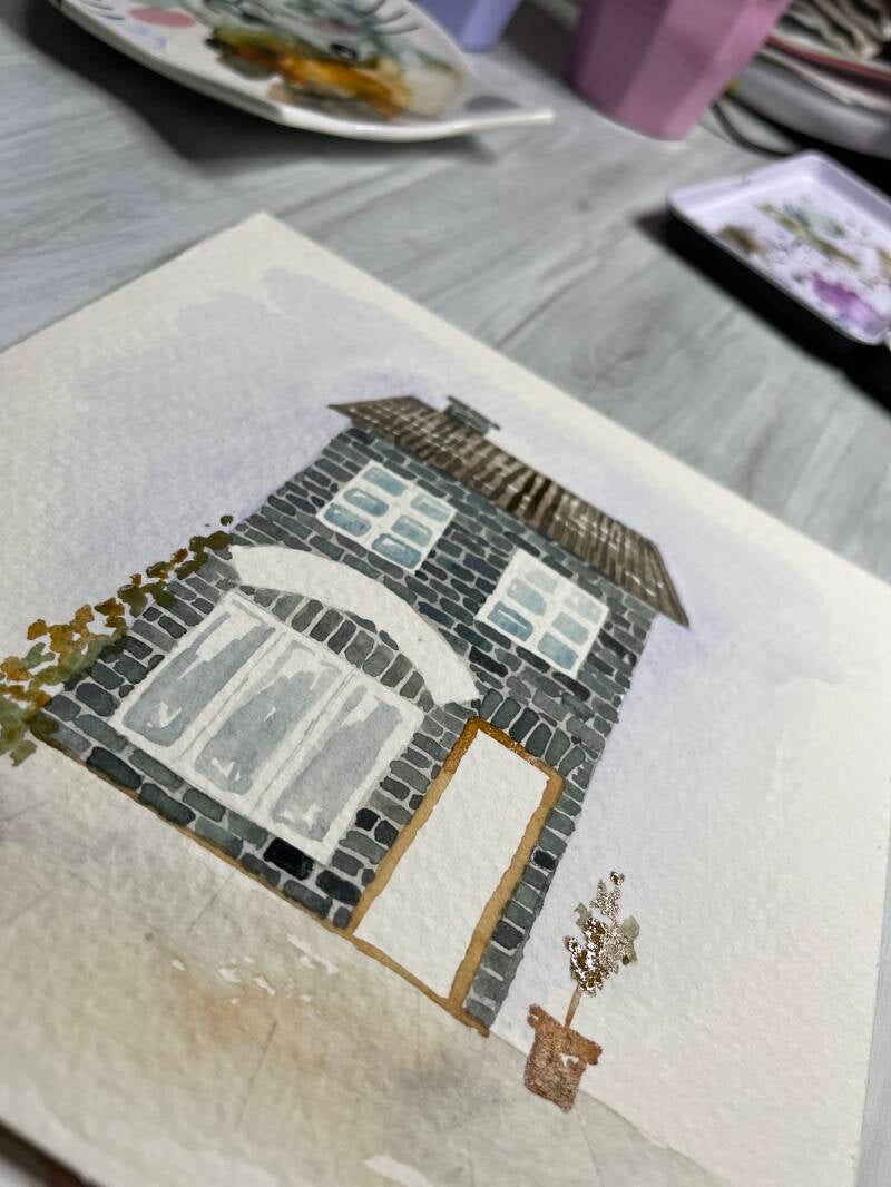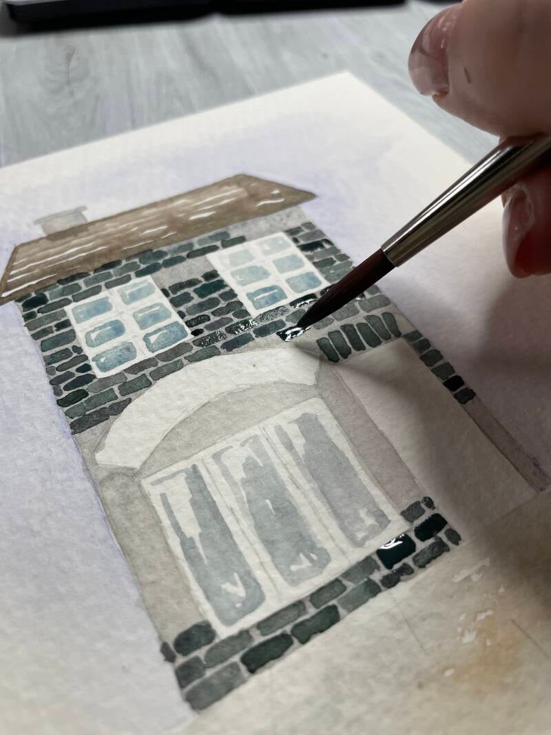 So ein Aquarellhäuschen ist (meiner Meinung nach) immer eine Fleißarbeit - vor allem die Klinkerfassade. Die Arbeit lohnt sich aber immer! Bei den Pflanzendetails braucht man sich dafür nicht so viel Mühe geben, kleine Tupfen reichen 😉