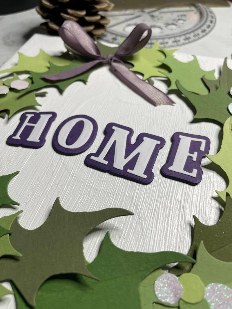 Dann hieß es: Blätter in den vorgezeichneten Kreis sortieren und mit der Heißklebepistole befestigen. Danach habe ich noch mehrere Varianten von Schleifen, Beeren und Schriftzügen ausprobiert, diese Kombi gefiel mir schließlich am besten: