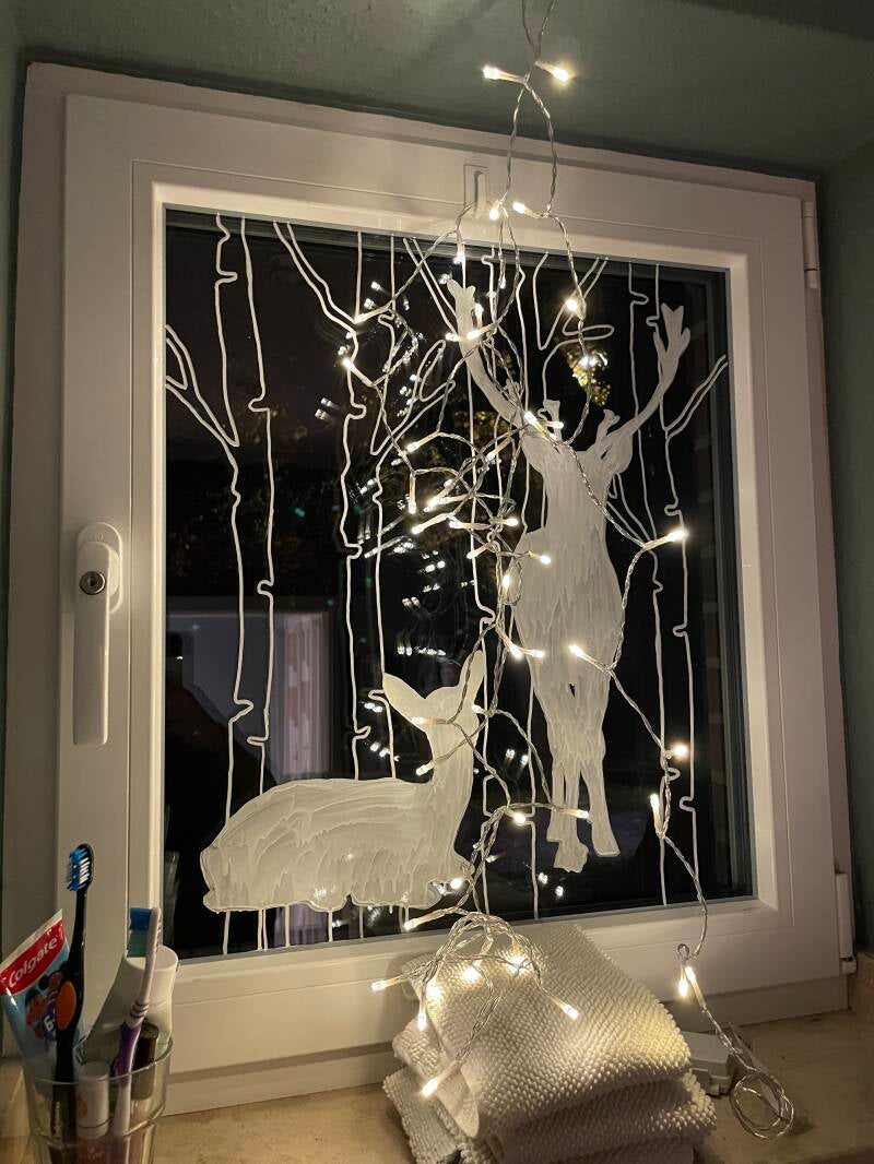 Was für ein Zufall, dass der große Discounter mit den 4 Buchstaben neulich Kreidestifte im Angebot hatte. So konnte ich meinen Vorrat auffüllen und gleich in die Vorweihnachts-Fensterplanung einsteigen. Und natürlich direkt in die Unsetzung mit meinen Wild-Motiven in den 3 kleinen Fenstern.