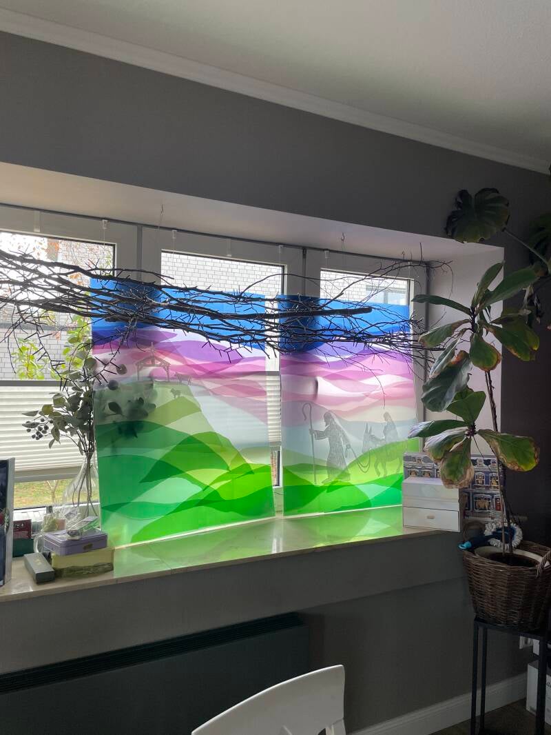 Da mich bei solchen Aktionen immer besonderer Ehrgeiz packt, etwas außergewöhnliches zu erschaffen, hat mein Mann mir zwei in unsere Büro-Fenster passende Plexiglas Scheiben besorgt... die nächste Bestellung war dickeres Transparentpapier in verschiedenen Farben, und schon konnte die Arbeit beginnen 👍🏻